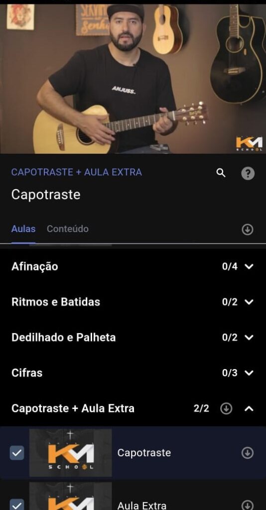 Aulas progressivas, desde fundamentos até técnicas mais avançadas, com exercícios práticos e músicas.